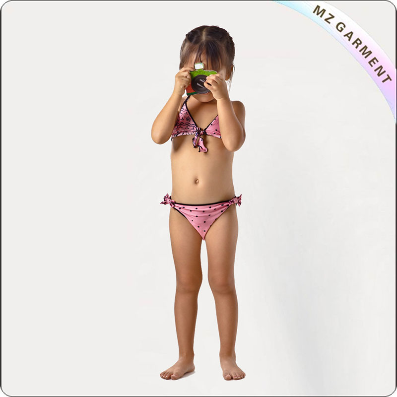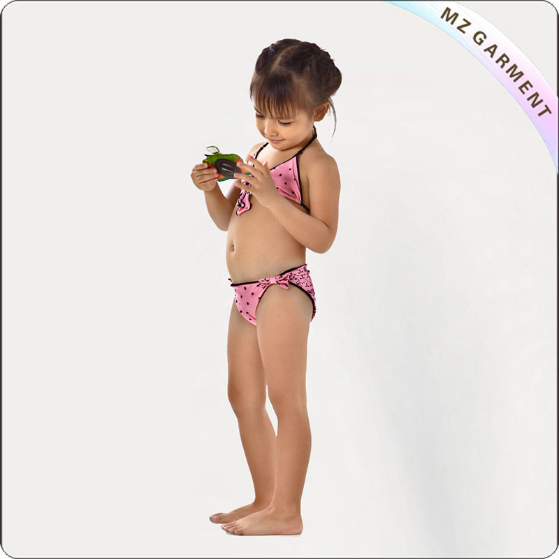 China Kids Trikini Manufacturer Company Makes Kids Dotted Trikini with Pink Design Pattern, Halter Top, Bowknot, 82% Nylon, 18% Elastane, XS-XL.