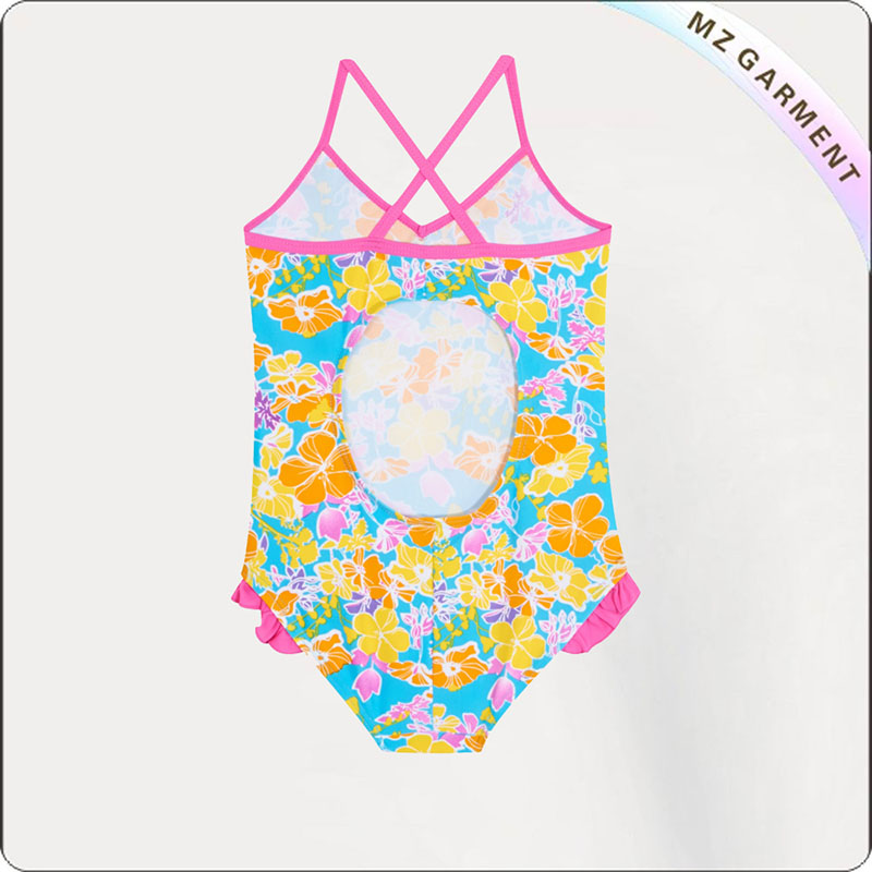 China Kids Bathing Cosutme Manufacturer Company Makes Kids Flower Bathing Cosutme with Fushia Edge, Twist Strap, Skin-Tight, Water Proof, 82% Nylon, 18% Elastane.