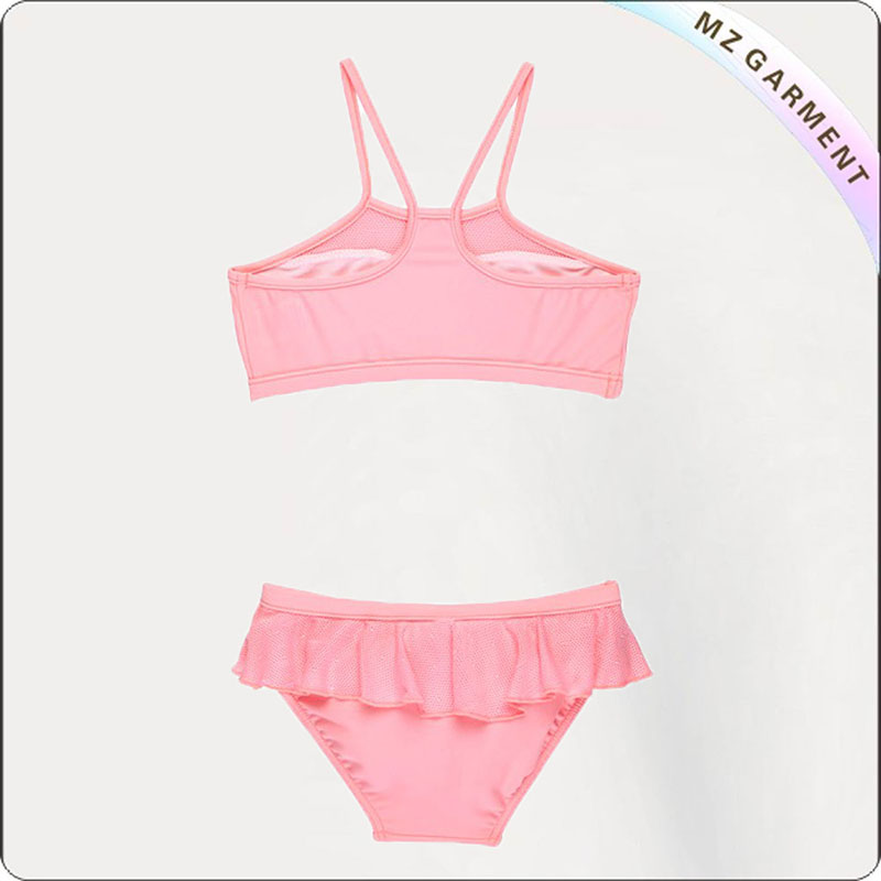China Kids Skirtini Manufacturer Company Makes Kids High Neck Skirtini with Pink Ruffle, Lined, Soft and Resistant Stretch Nylon, XS-XL, OEM Service.
