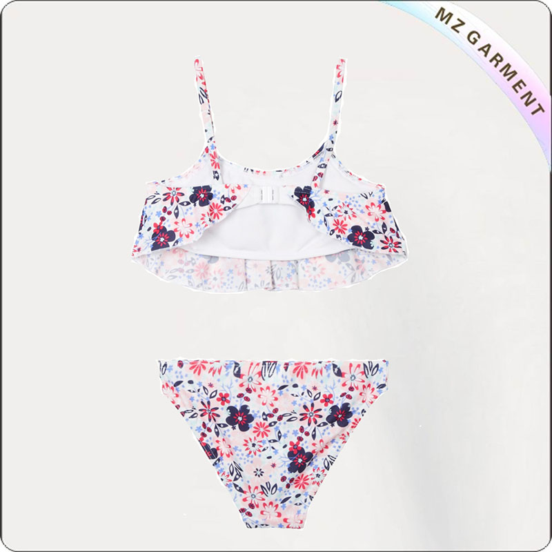 China Kids Bikini Suit Manufacturer Company Makes Kids Ruffle Trim Bikini Suit with Floral Print, Soft and Resistant Stretch Nylon, XS-XL, OEM Service.